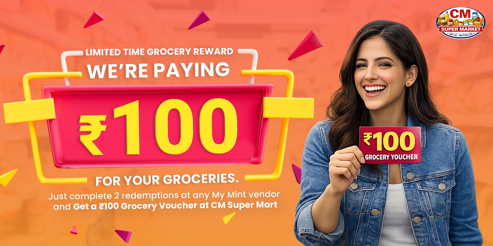 You’ve received a ₹100 Grocery Voucher fully paid by us, with NO minimum purchase required. Simply redeem it at CM Super Mart and enjoy your savings! 🛒💸